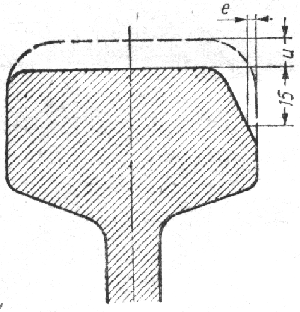 4. W razie bocznego zużycia główki zużycie pionowe u powimno być mniejsze niż dopuszczalne N (określone w ust. 3) o połowę zużycia bocznego e, mierzonego 15 mm poniżej powierzchni. tocznej szyny zużytej (rys. 10.1)