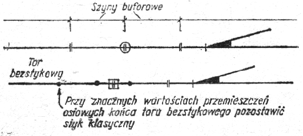 5. podstawowym rozwiązaniem izolowanego złącza klejono-sprężonego jest styk wiszący. Rozwiązanie to wymaga określonej zmiany rozstawu podkładów symetrycznie z obu stron osi styku. Przy wbudowaniu złącza izolowanego klejono-sprężonego w rozjazdach należy przesunąć podrozjazdnice zgodnie z wymiarami podanymi w dokumentacji. Podobnie - w razie potrzeby - należy przesunąć podrozjazdnice w celu umieszczenia spawów termitowych w okienkach między nimi