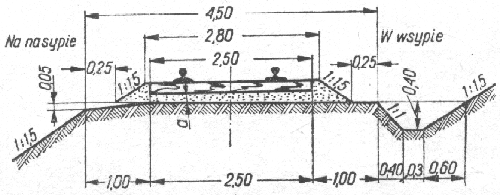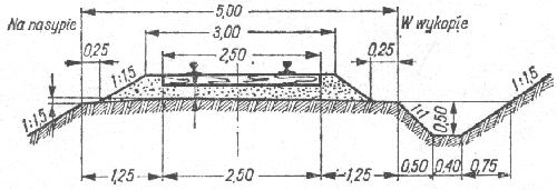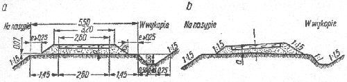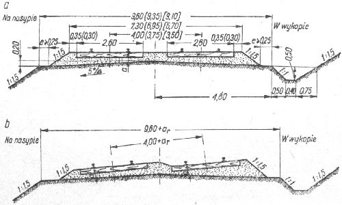 Rys.7.6. Linie jednotorowe z jednostronnym pochyleniem ławy torowiska (przy stosowaniu oczyszczarek podsypki)