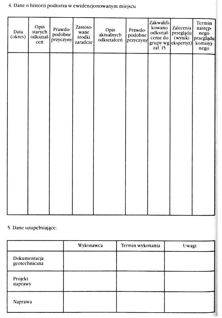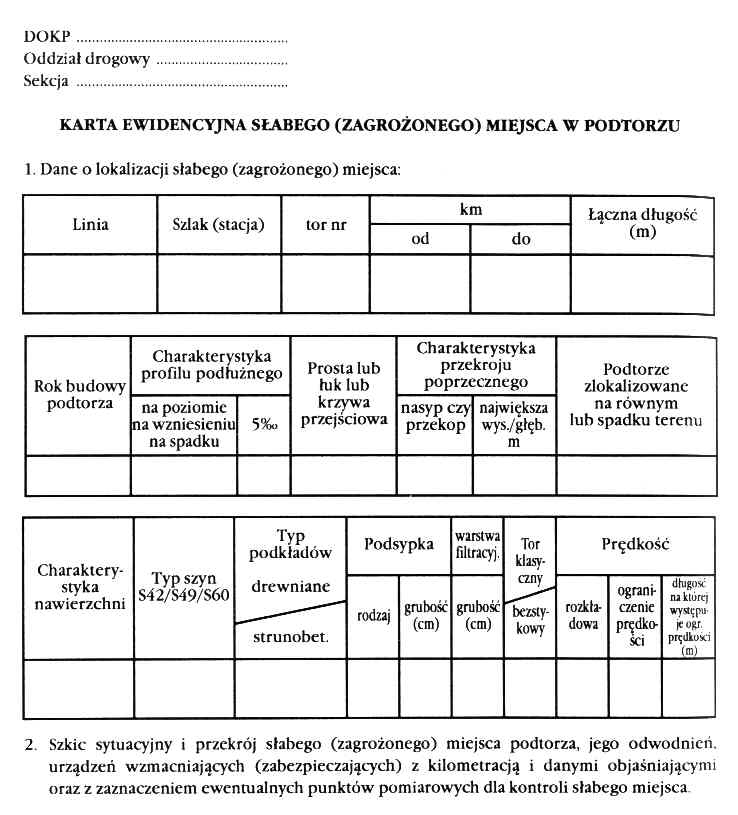 1 Kartę ewidencyjną sporządza się dla tych miejsc w podtorzu, których stan jest powodem wprowadzenia ograniczeń w eksploatacji drogi kablowej (ograniczenie prędkości, zmniejszenie nacisków osi, zamknięcie toru dla ruchu) lub istnieje obawa ich wystąpienia.