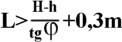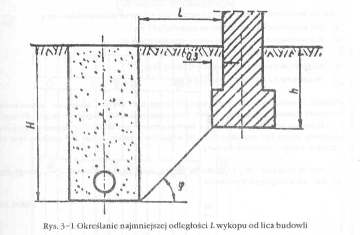 1. Odległość wykopu dla ciągu odwodnieniowego od budowy określa się każdorazowo, biorąc pod uwagę poziom posadowienia budowli, głębokość wykopu oraz wytrzymałość gruntu w rejonie robót. Jeśli wykop ma sięgać poniżej spodu fundamentu budowli, to minimalną odległość L ściany wykopu od lica budowli określa się wg wzoru rys. 3-1, z następującego wzoru: