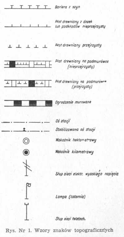 2. Jeżeli teren nie jest równy (poziomy), to oprócz olanu sytuacyjnego należy sporządzić jeden lub kilka profili terenu w miejscach charakterystycznych lub nanieść na plan również warstwice. Przy oznaczaniu na planie poszczególnych elementów terenu i dekoracji można posługiwać się ogólnie przyjętymi znakami (patrz rys. 1).