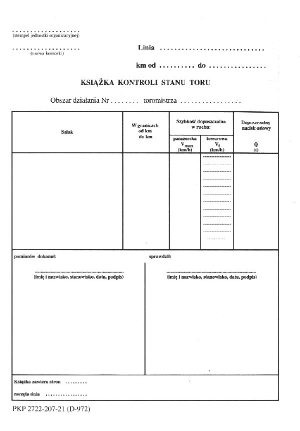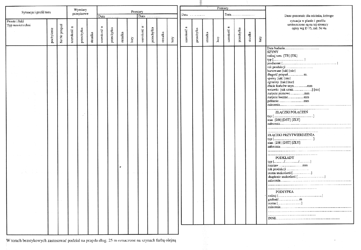 W ostatniej kolumnie "Książki kontroli stanu toru" należy wpisać zmierzone lub stwierdzone w czasie badania technicznego dane dotyczące rodzaju i stanu nawierzchni według poniższych zasad.
