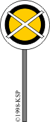 | Dzienny Okrągła tarcza pomarańczowa z czarnym pierścieniem i białą obwódką, a pod nią biała strzała z czerwoną obwódką, skierowana ukośnie pod kątem 45 st. w dół na prawo od słupa tarczy |