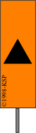 Pomarańczowa tablica pozioma, a na niej dwa czarne kąty - jeden obok drugiego, stykające sie wierzchołkami, ustawiona skośnie do toru
