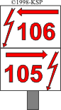Trzy, kolejno po sobie następujące, prostokątne lub kwadratowe tablice białe : z trzema, dwoma i jednym czarnymi pasami, wznoszącymi się ukośnie z lewa na prawo, a ponadto na czarnych pasach strzała czerwona w kształcie błyskawicy, zwrócona ostrzem ku dołowi