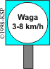 Matowobiałe światło na jasnoniebieskim tle, a na nim napis "Waga x km/h" gdzie x oznacza prędkość przejazdu w km/h
