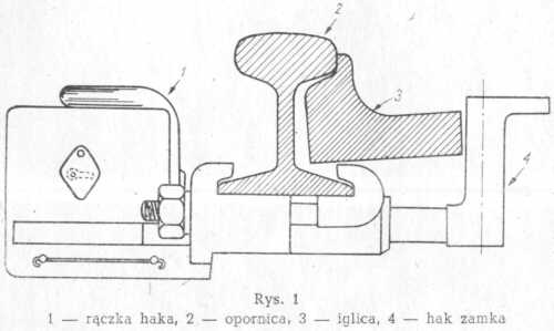Przytrzymanie iglicy w położeniu dosuniętym za pomocą haka. zamka uwidocznione jest na rys. 1.