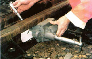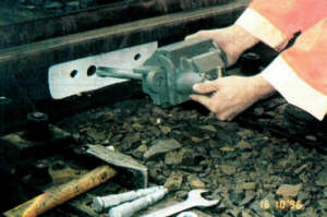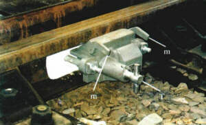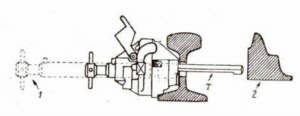 Miejsce na opornicy, w którym należy założyć zwrotnicowy zamek kluczowy, oznaczone jest przez pomalowanie szyjki szyny na biało (rys. 2). Przytrzymywanie iglicy w położeniu odsuniętym za pomocą trzpienia uwidocznione jest na rys. l.