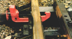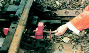 a) Miejsce na opornicy, w którym należy założyć sponę iglicowa, oznaczone jest małym otworem w szyjce szyny, obwiedzionym białym kolorem (rys. 5). W otwór ten należy włożyć ostrze śrubowego sworznia spony.