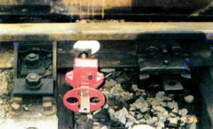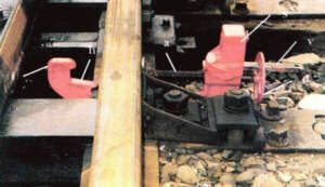 6. Zamek spony zamknąć. Po zabezpieczeniu zwrotnicy klucz da się wyciągnąć z zamka.