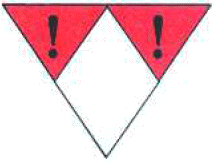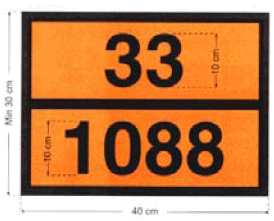 towarów niebezpiecznych. Znak umieszczony na obu ścianach bocznych wagonu cysterny lub kontenera, a także wagonów dużych, kontenerów i małych kontenerów dla towarów przewożonych luzem. Oznaczenie może być podane w postaci tablicy, folii samoprzylepnej lub rysunku. W przypadku wagonu cysterny z dzielonym zbiornikiem, znak umieszczany jest dla każdego zbiornika na oddzielnej tabliczce. Znak oznacza, że przesyłka w wagonie stanowi zagrożenie określone kodem licznika, jakie może stwarzać dany materiał. Poszczególne cyfry oznaczają: 2 - emisja gazu w wyniku ciśnienia lub reakcji chemicznej, 3 - zapalność materiałów ciekłych i gazów, 4 - zapalność materiałów stałych, 5 - działanie utleniające (podtrzymujące palenie), 6 - właściwości trujące (toksyczność), 7 - właściwości promieniotwórcze, 8 - działanie żrące, 9 - niebezpieczeństwo samorzutnej gwałtownej reakcji. Podwojenie cyfr wskazuje na nasilenie odpowiedniego zagrożenia. Jeżeli zagrożenie od materiału może być wystarczająco określone jedną cyfrą, wówczas po tej cyfrze stawia się zero. Cyfry w mianowniku określają nr klasyfikacji handlowej materiału i nie mają znaczenia dla określania stopnia zagrożenia. Ograniczenia podczas manewrów wynikają z treści nalepek ostrzegawczych umieszczonych na wagonie. |