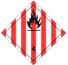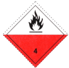 Materiały samozapalne Symbol (płomień): czarny na białym (górna połowa) i czerwonym tle (dolna połowa); cyfra "4" w dolnym rogu. |