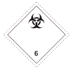 Materiały zakaźne Symbol (koło, trzy stykające się symbole sierpa) i dane: czarne na białym tle; cyfra "6" w dolnym rogu; w dolnej połowie nalepki ostrzegawczej umieścić napis: "MATERIAŁY ZAKAŹNE" i "PRZY USZKODZENIU LUB WYDOBYWANIU SIĘ NIEZWŁOCZNIE POWIADOMIĆ WŁADZE SANITARNE". |