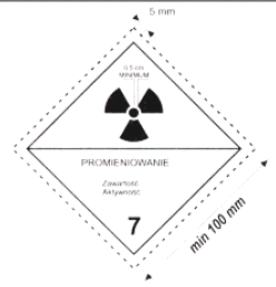 Materiały promieniotwórcze2 kategoria III - ŻÓŁTA; symbol promieniowania: czarny na żółtym z białym obrzeżem (górna połowa) i na białym tle (dolna połowa) tle; napis: czarny w dolnej połowie nalepki: "PROMIENIOWANIE", "ZAWARTOŚĆ...", "AKTYWNOŚĆ ..."; w polu obramowanym na czarno: "WSKAŹNIK TRANSPORTOWY" po wyrazie "PROMIENIOWANIE" trzy czerwone pionowe paski; cyfra "7" w dolnym rogu. |