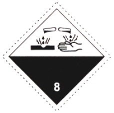 Materiały żrące Symbol (ciecze, które spadają z dwóch próbówek i oddziałują na rękę i metal): czarne na białym tle (górna połowa); czarne tło z białym obrzeżem (dolna połowa); cyfra "8" w dolnym rogu. |