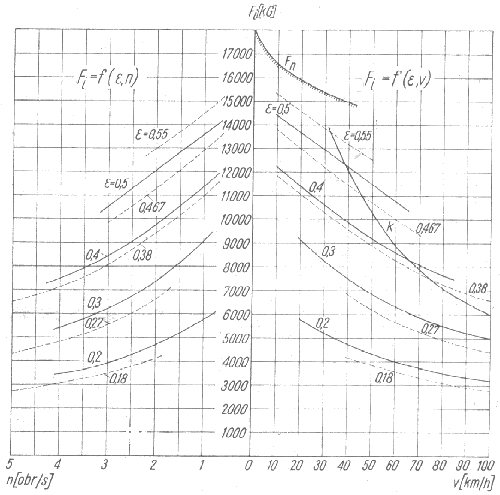 Wykres wartości sił pociągowych w zależności od szybkości i napełnień