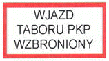 czerwonym obramowaniem i napisem "WJAZD TABORU PKP WZBRONIONY" |