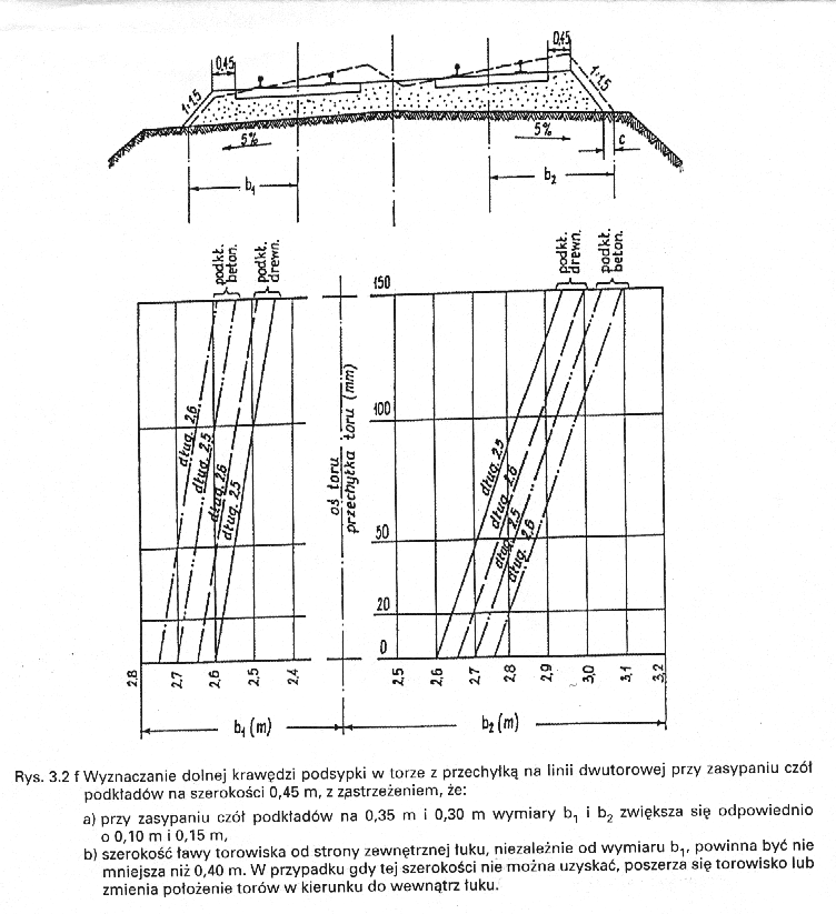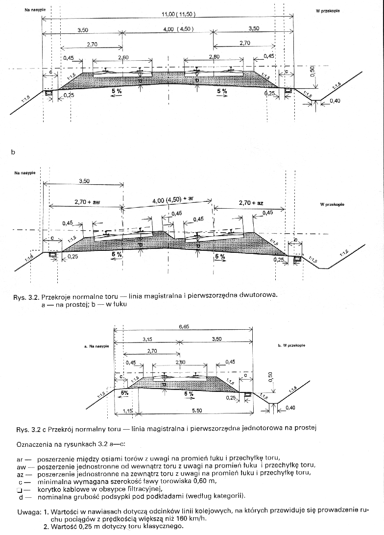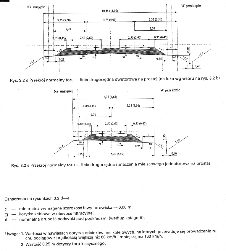 3. Przekroje normalne toru na prostej i w łukach, w zależności od kategorii linii kolejowej, przedstawiają rysunki 3.2 a-e.