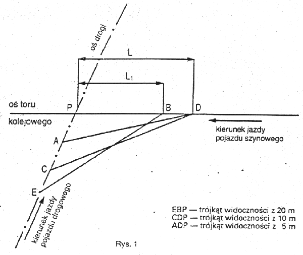 3. Z punktu E czoło pojazdu szynowego powinno być widoczne począwszy od punktu B. W miarę zbliżania się pojazdu drogowego do przejazdu odcinek widoczności pojazdu szynowego powinien się zwiększyć, tak aby z odległości 10 m od skrajnej szyny (punkt C) czoło pojazdu szynowego było widoczne co najmniej od punktu D. Widoczność pojazdu szynowego z drogi ustala się dla obu stron przejazdu, a w razie wprowadzenia na drodze ruchu jednokierunkowego widoczność ustala się od strony, z której nadjeżdżają pojazdy.
