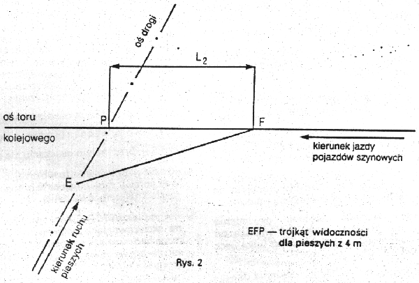 2. W zwykłych warunkach atmosferycznych latarnie sygnałowe czoła zbliżającego się pojazdu szynowego powinny być widoczne z obu stron przejścia, z odległości co najmniej 4 m, mierząc od skrajnych szyn toru, przez cały czas zbliżania się pojazdu szynowego do przejścia, począwszy od punktu E. Długość odcinka widoczności L2, mierzoną od osi przejazdu, określa się według wzoru: