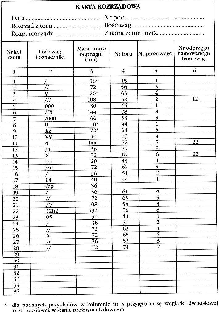 7. Karta rozrządowa służy do powiadamiania pracowników zatrudnionych przy rozrządzie o wielkości i kolejności kierowania odprzęgów na poszczególne tory relacyjne. Ponadto w karcie rozrządowej, poprzez umieszczenie obok odprzęgu właściwego oznacznika należy wskazać szczególne warunku rozrządzania. W nagłówku karty rozrządowej należy wskazać datę, numer pociągu, z którego pochodzi rozrządzany tabor, ilość wagonów, tor z którego dokonuje się rozrządu oraz rozpoczęcie i zakończenie rozrządu.