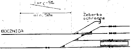 1. Jeżeli tor bocznicowy ma pochylenie średnie w kierunku torów głównych i zachodzi obawa stoczenia się wagonów na tory stacyjne to zaleca się zastosowanie żeberka ochronnego, ułożonego jak najbliżej ukresu zwrotnicy odgałęziającej (rys. 12.1)